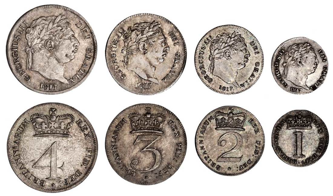 Great Britain. George III (1760-1820). "New Coinage". Maundy Set, 1817. Penny, 2, 3 and 4 Pence. Laureate, short-haired head right, rev. Crowned numeral value. S.3792. Soft iridescent hues. Brilliant Uncirculated. (Set of 4)