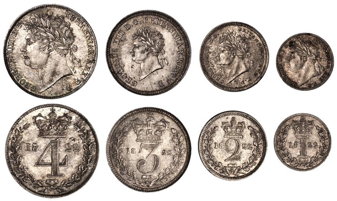 Great Britain George IV (1820-1830). Maundy Set, 1822. Penny, 2, 3 and 4 Pence. Laureate head left, rev. Crowned numeral value dividing date, all within wreath. S.3816, KM MDS66. Choice AU-Uncirculated. (Set of 4)