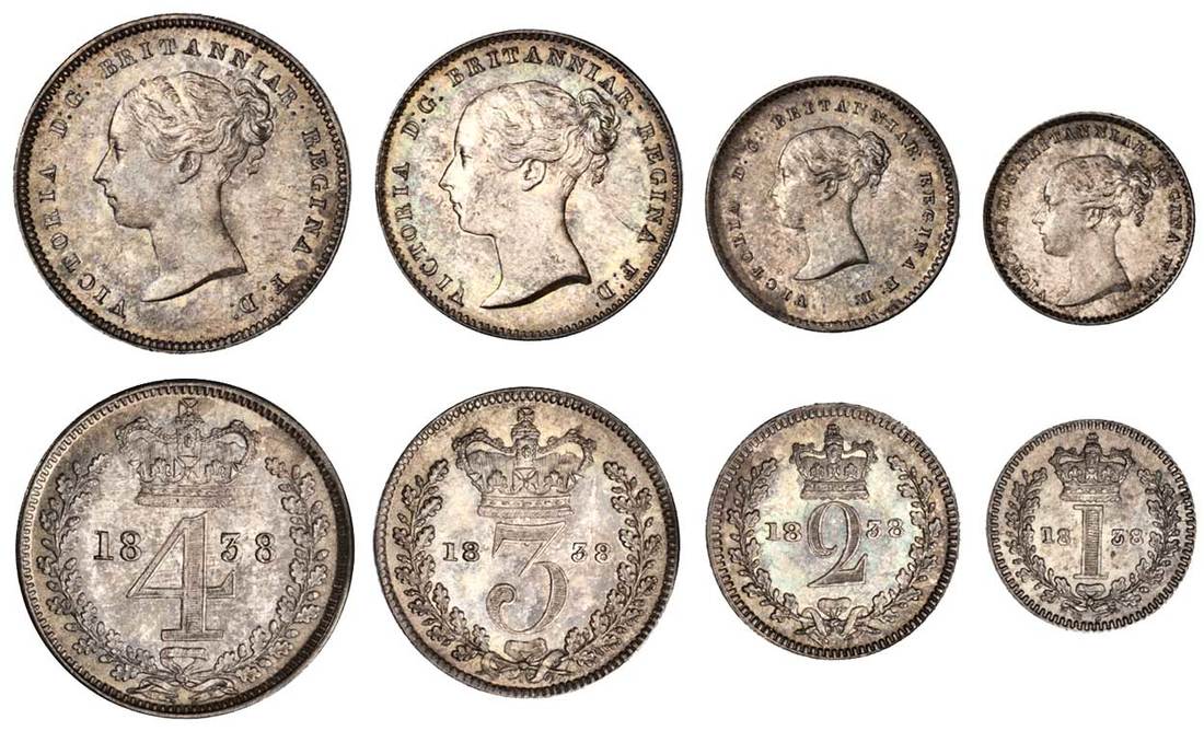 Great Britain. Victoria (1837-1901). Maundy Set, 1838. Penny, 2, 3 and 4 Pence. Bare, young head left, rev.Crowned numeral value dividing date, all within wreath. S.3916, KM MDS86. Lovely pale violet-gray with iridescent highlights. Prooflike Brilliant Uncirculated. (Set of 4)