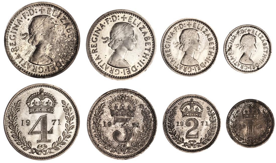 Great Britain. Elizabeth II (1952-). Tewkesbury Abbey. Maundy Set, 1971. Silver Penny, 2, 3 and 4 Pence. Laureate head right. S.4211, KM MDS230. Prooflike Brilliant Uncirculated. (Set of 4)