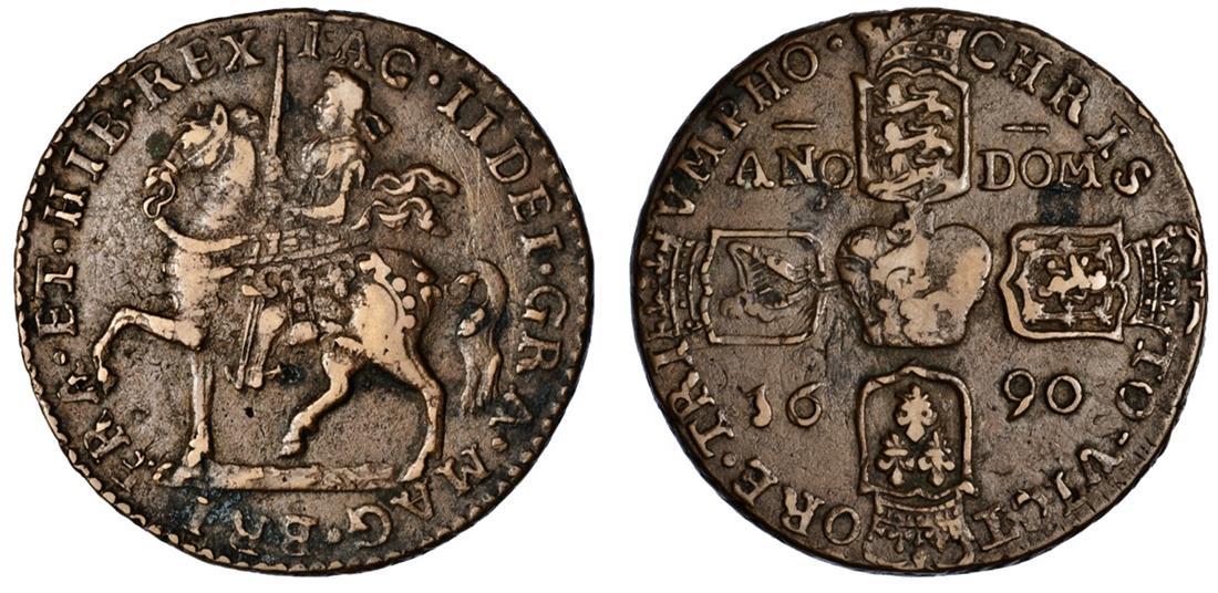 Ireland. James II (1685-1691). Civil War. "Gunmoney" Crown, 1690. King astride horse left, rev. Crowned cruciform Arms, crown at center. S.6578. A few minor deposits. Very Fine.
