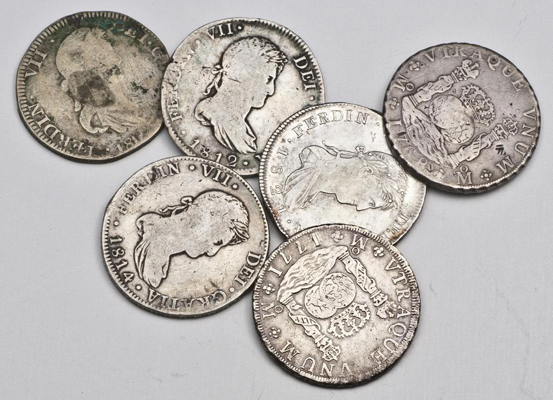 Mexico. Small lot of 8 Reales: Carlos III (1759-1788). "Pillar Dollars" - Dos Mundos types, 1768 MF, 1771 FM. KM 105. The first a few small chops each side and shallow scrape, plug? at center, Fine-VF, the latter grainy surfaces (sea-salved), Extremely Fine; Fernando VII (1808-1821) - 1812, 1814. KM 111. VG-About Fine; War of Independence. Zacatecas -- 1821 Zs RG. Good Extremely Fine; and low-grade 1816 Zs AG. (6)