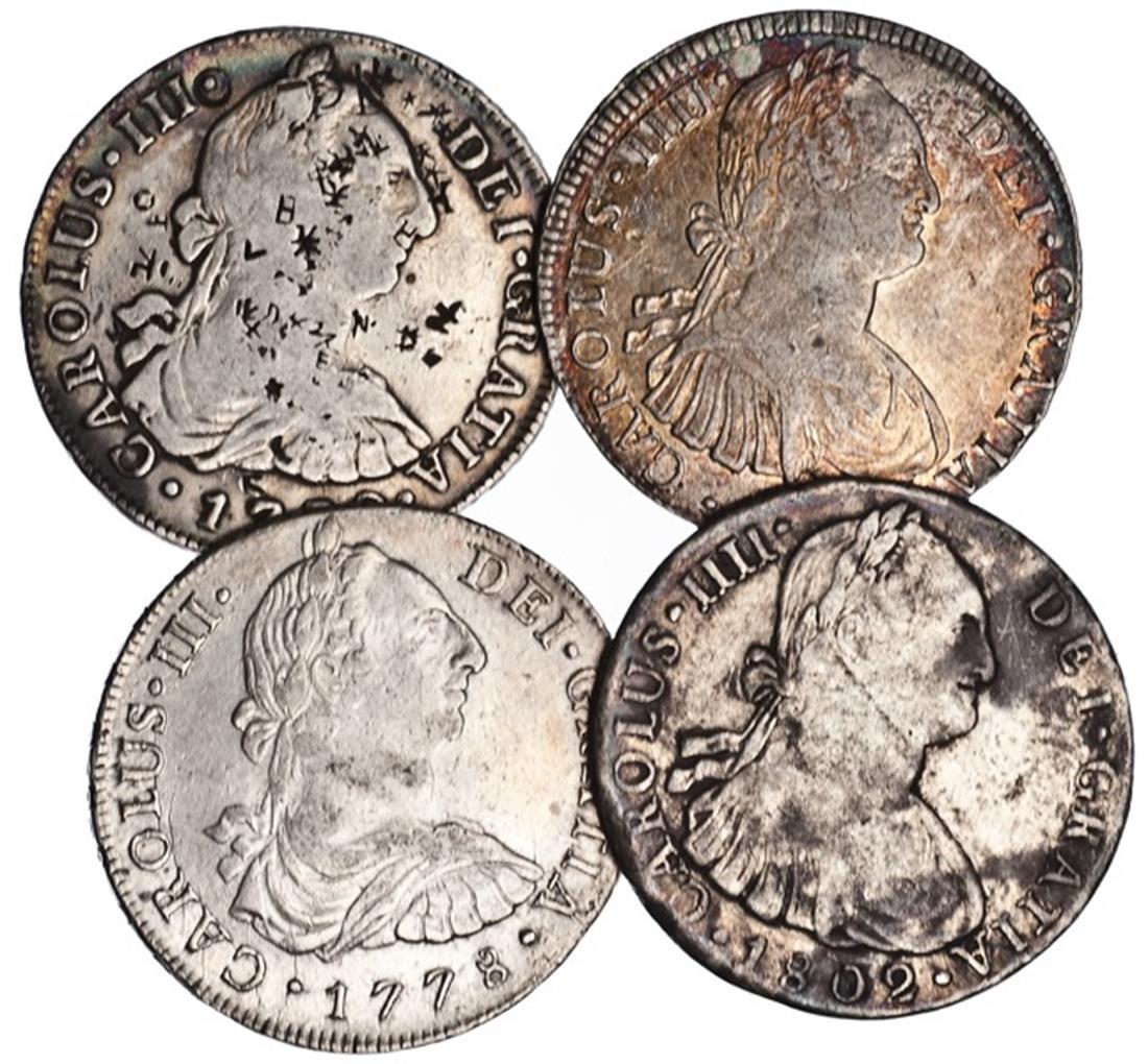 Peru. Carlos III-Carlos IV. Quartet of 8 Reales: 1778, 1779 MJ, 1802 IJ, 1808 JP. Lima. Laureate, draped and cuirassed bust right, revs. Crowned Arms flanked by Pillars. KM 78, 97. The second About Fine with a number of small chopmarks, the third dark areas and obverse scratches, Fine. The first and last toned Very Fine-About Extremely Fine. (4)