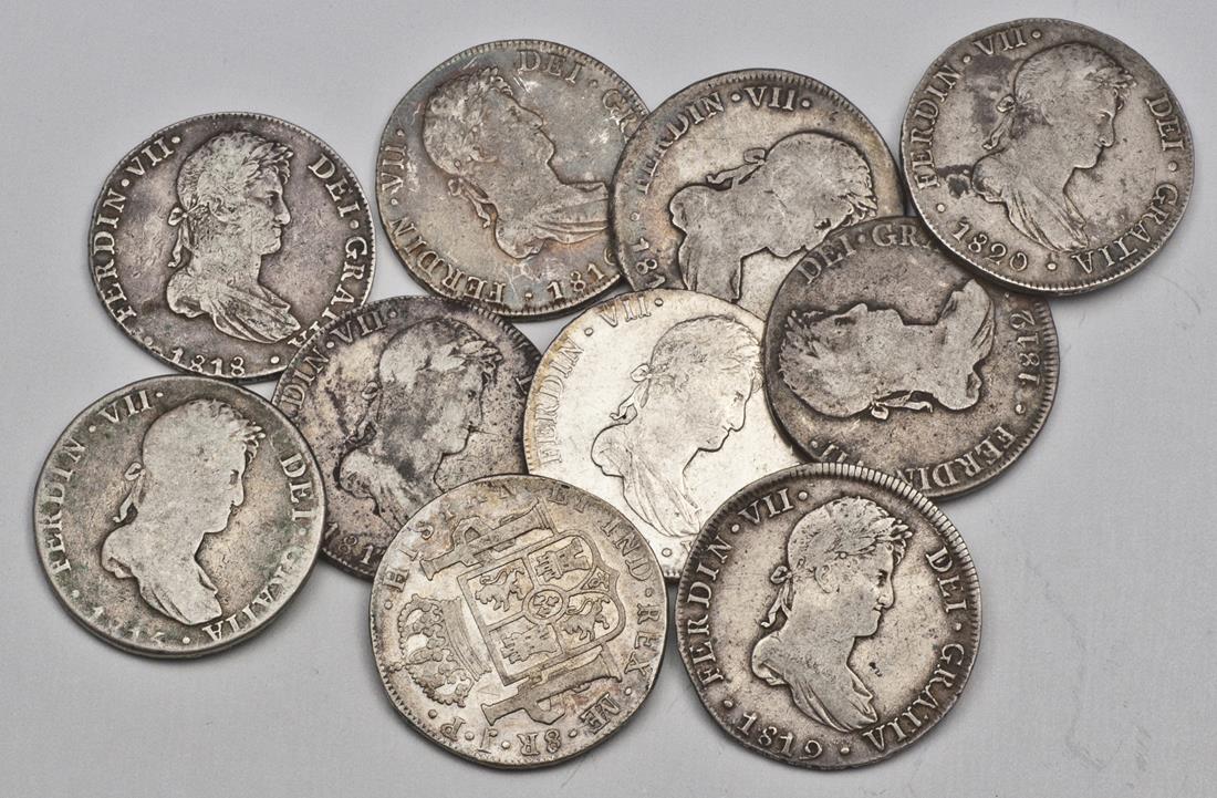 Peru. Fernando VII (1808-1822). Run of 8 Reales: 1810, 1811 (KM 117.1), 1812, 1813, 1815, 1816, 1817, 1818, 1819, and 1820 JP. Lima. Smaller imaginary bust r.; laureate, draped bust right, rev. Crowned Arms flanked by Pillars. KM 106.2, 117.1. One with earthen green reverse deposits, one with light graffiti. Very Good- About Very Fine. (10)