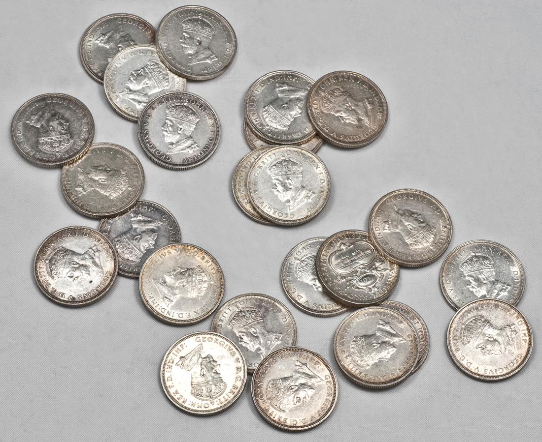 Australia. George V (1910-1936). Lot of higher grade 1927 Commemorative Florins. Opening of Parliament House in Canberra. Crowned bust left, rev. Cameo view of the building, crossed scepters and date on raised cartouche below. KM 31. Some with light bagmarks. AU-Uncirculated. (24)