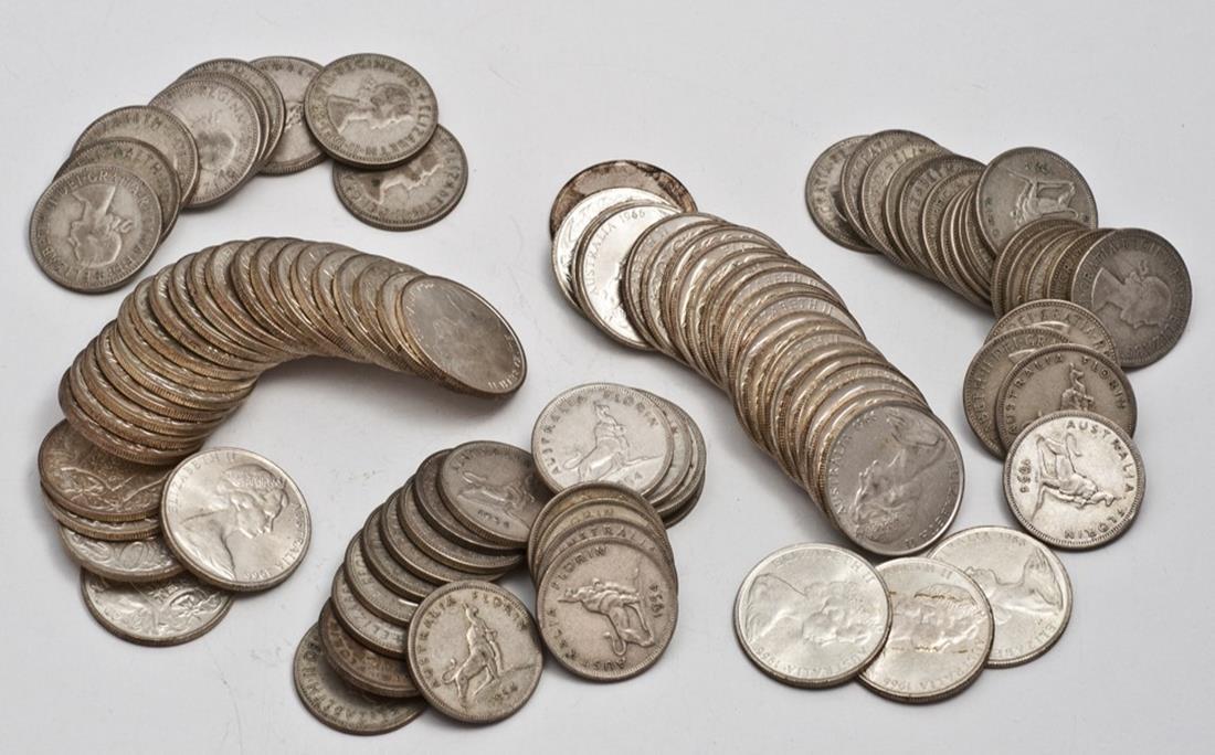 Australia. Elizabeth II (1952-). Pair of silver Rolls - Roll of 50 Royal Visit 1954 Florin. KM 55, and Roll of 50 1966 50 Cent pieces. KM 67. The Florins mostly Fine-Very Fine, the 50 Cents Uncirculated. (100)