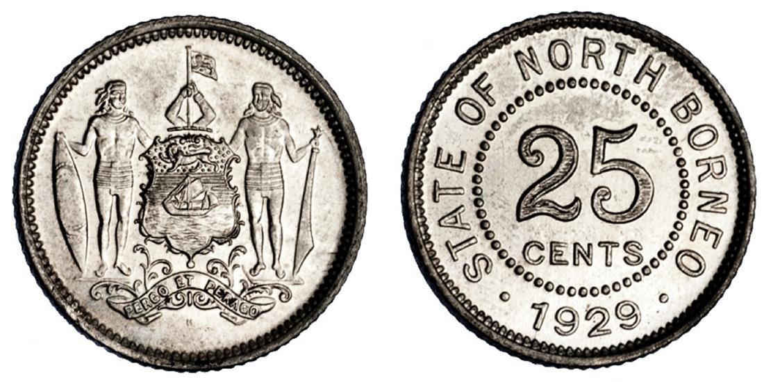 British North Borneo. 25 Cents, 1929 H. Heaton. Arms supported by Dayak warriors. KM 6. Choice Brilliant Uncirculated.