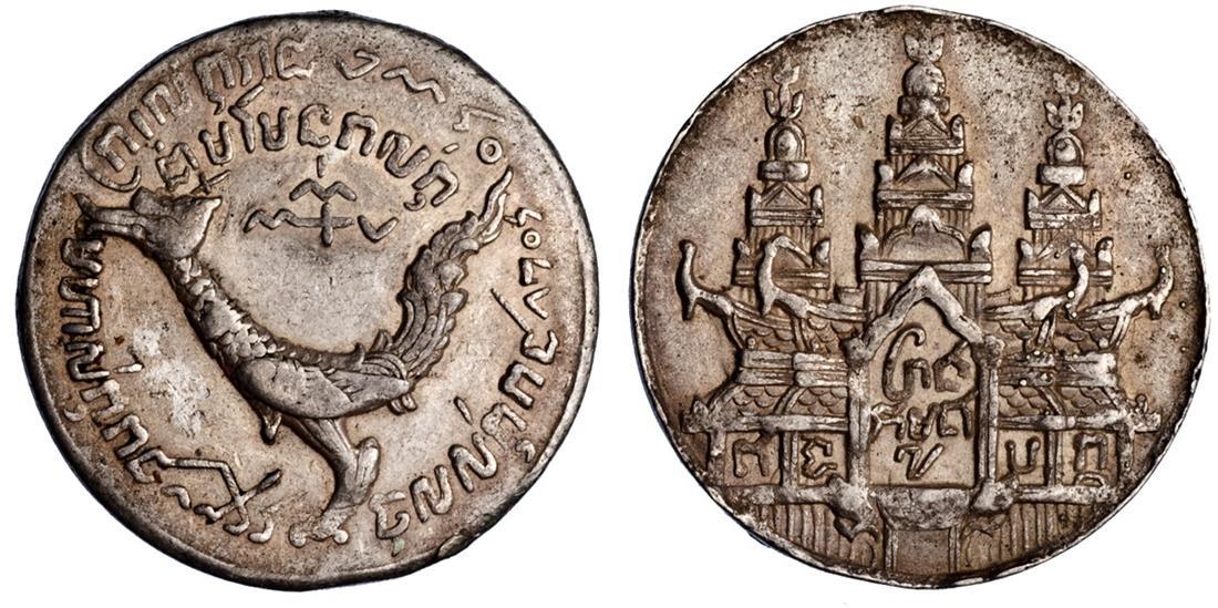 Cambodia. Ang Duong (1840-1860). Tical, CS 1208 (1847). Hamza bird left, legend around, rev. Temple, legend in portico and alcoves. Good Very Fine.