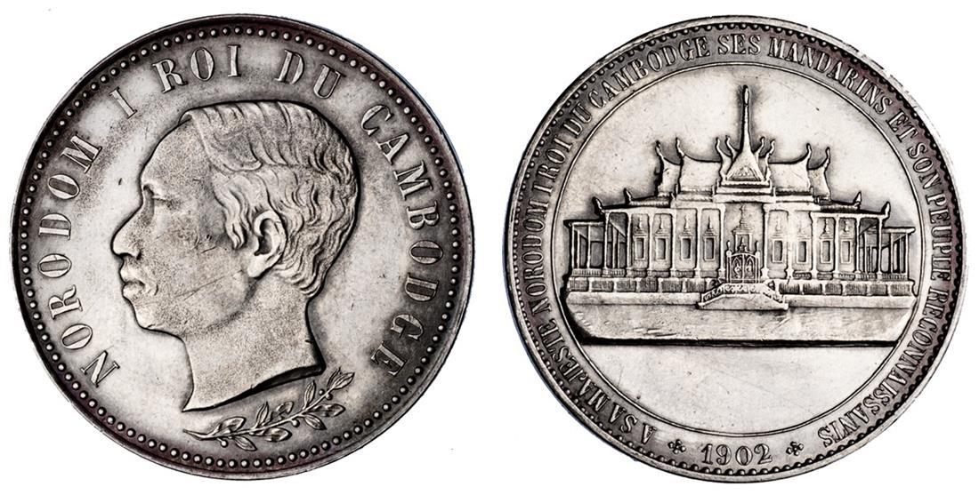 Cambodia. Norodom I (1859-1904). Medallic 4 Francs, 1902. Recognition of King Norodom by his Mandarins and People. 16.37 gms. By Charles Wurden. King's head left, olive branch below, rev. Façade of the Royal Palace in Phnom Penh. Gad.18, Lecompte 123, Maz.508. A few hairlines, About Extremely Fine.