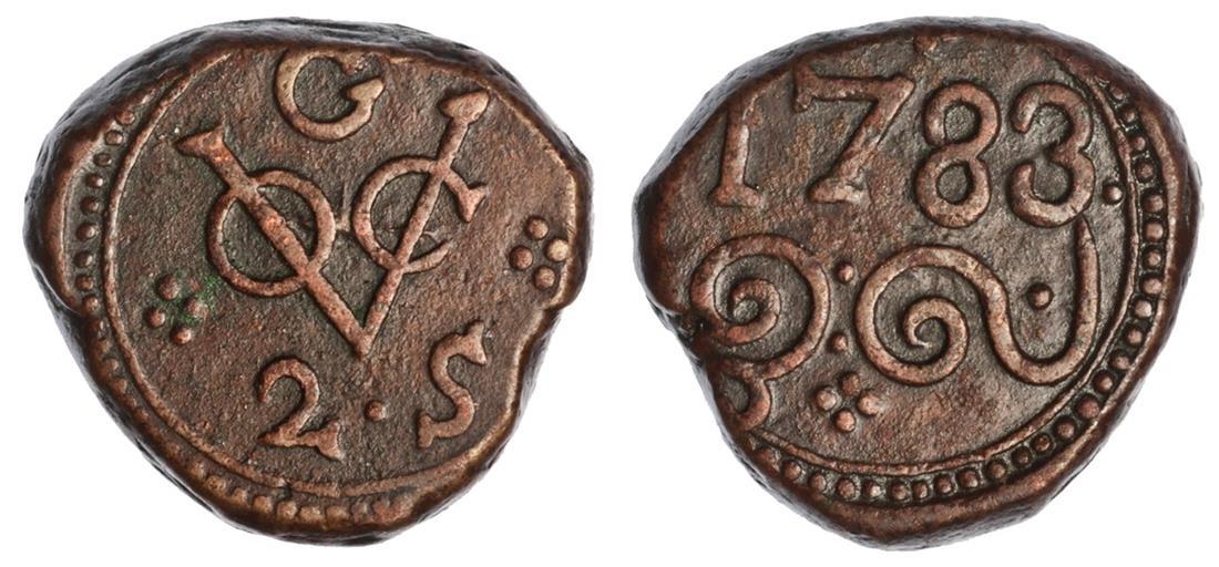 Ceylon. Dutch rule. 2 Stuivers, 1783 G. Galle. VOC monogram, mm above, value below, rev. Date with flourish. KM 30. Choice Very Fine.