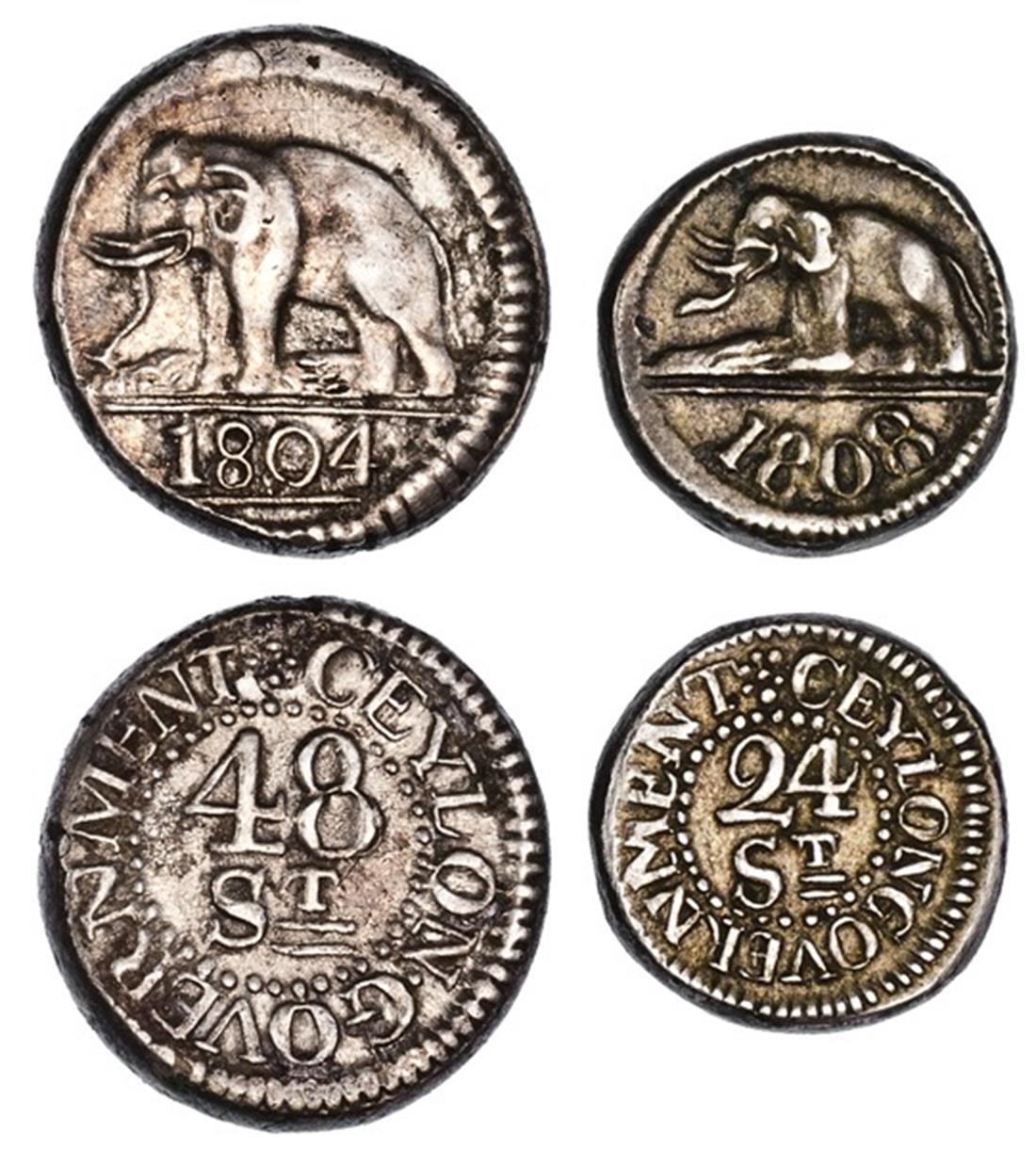 Ceylon. George III (1796-1820). Pair of "Dump" Silver issues: 48 Stivers, 1804, 24 Stivers, 1808. Elephant standing left, date below. KM 77, 76. The first a few minor hairlines in field. About Extremely Fine-Extremely Fine. (2)