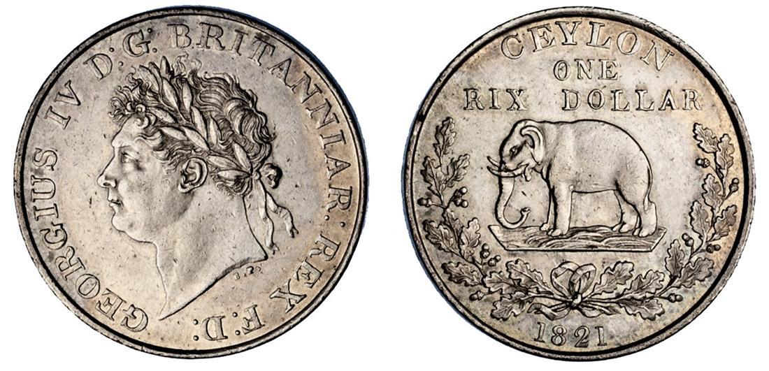 Ceylon. George IV (1820-1830). Rixdollar, 1821. Laureate head left, rev. Elephant standing left, spray below. KM 84. Extremely Fine.