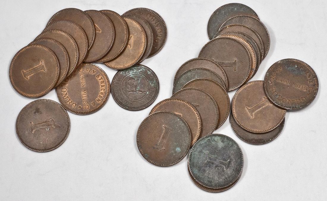 Ceylon. Colombo. Lot (29) of Carey Strachan & Co., Union Mills Tokens, struck ca. 1873. Bronze. Company and city name, rev. Large "1". Prid.6, Mit.2233. These token, used on the tea and coffee estate and factory, had a spending value of about 17 Cents. Some with dirt or deposits. About VF to EF; also Wekande Mills 1843 Token. (30)
