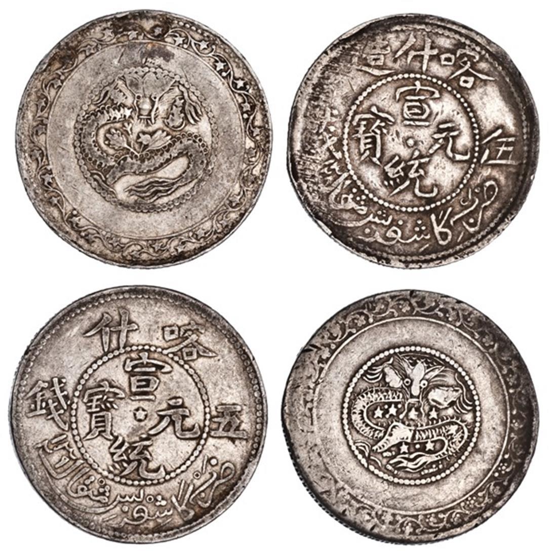 China. Sinkiang (Xinjiang). Pair of 5 Miscals: Kashghar, AH 1328. 17.15 gms. Chinese and Turki legends, dot at center, rev. Dragon at center of beaded, blank and floral borders. Y.27.1; Kashghar, AH 1329. 17.12 gms. Types similar to last, star at center. Y.A28.2. Both Very Fine. (2)
