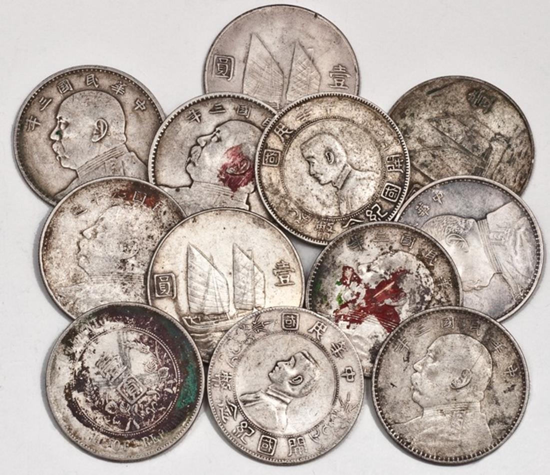 China. Republic. One dozen Silver Dollars. Yuan Shih-kai types - year 3 (4), year 10 (2); (1927) Memento types (3), and Junk Dollars, year 23 (3). Three Yuan Shih-kai types with red dye stain. Some with dirt/deposits, a few with hairline scratches. Fine-Extremely Fine. (12)