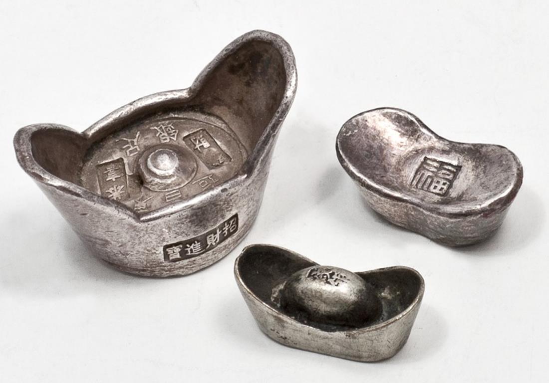China. Trio of "Boat" (or "Boat") Sycee. Dung Chang Province. 20th Century. 62.45 gms. Dung chang ju yin ("Dung Chang pure silver") inside center around raised disk, four lines of characters on bottom around central character, zhao zai jin pao ("Let the wealth grow and treasure come in the house") stamped on side. About Extremely Fine; small types, late 19th-20th Century. 12.25 and 21.83 gms. The first with characters on inside raised dome, the latter with two seal script characters on inside; short sides. The heavier with some hairlines on inside surface. Fine and Extremely Fine. (3)
