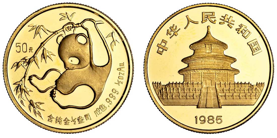 China. People's Republic. 50 Yuan, 1985. Temple of Heaven, rev. Panda left hanging from bamboo branch, numeral value at upper left. KM 117. Prooflike fields. Choice Brilliant Uncirculated.