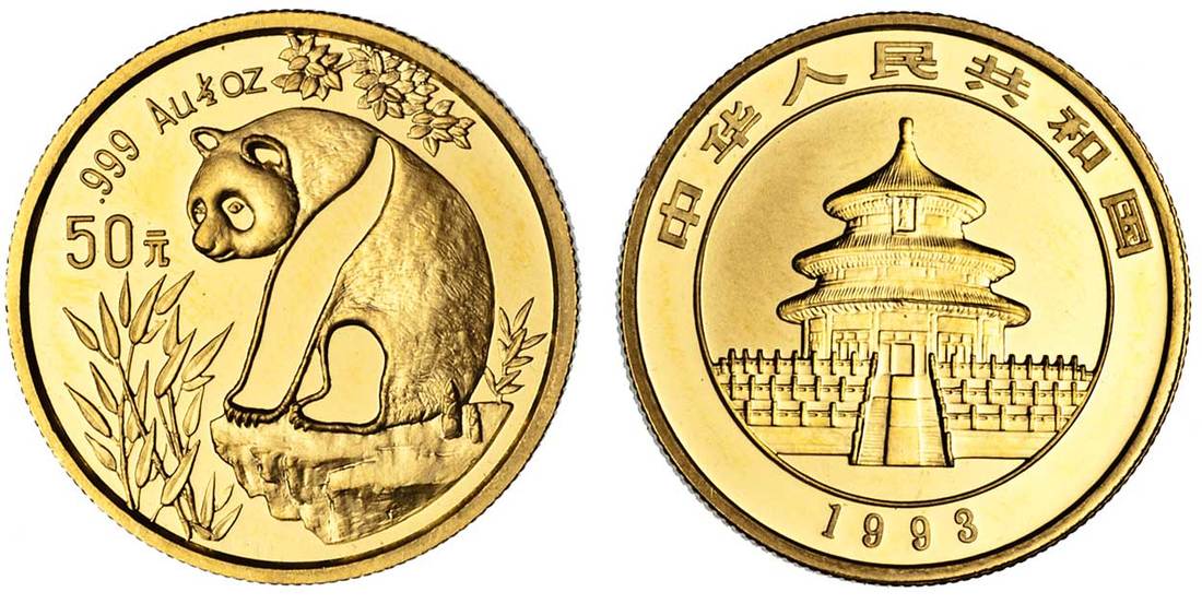China. People's Republic. 50 Yuan, 1993. Temple of Heaven within inner circle, rev. Panda seated left on flat rock. KM A614. Prooflike fields. Gem Brilliant Uncirculated.