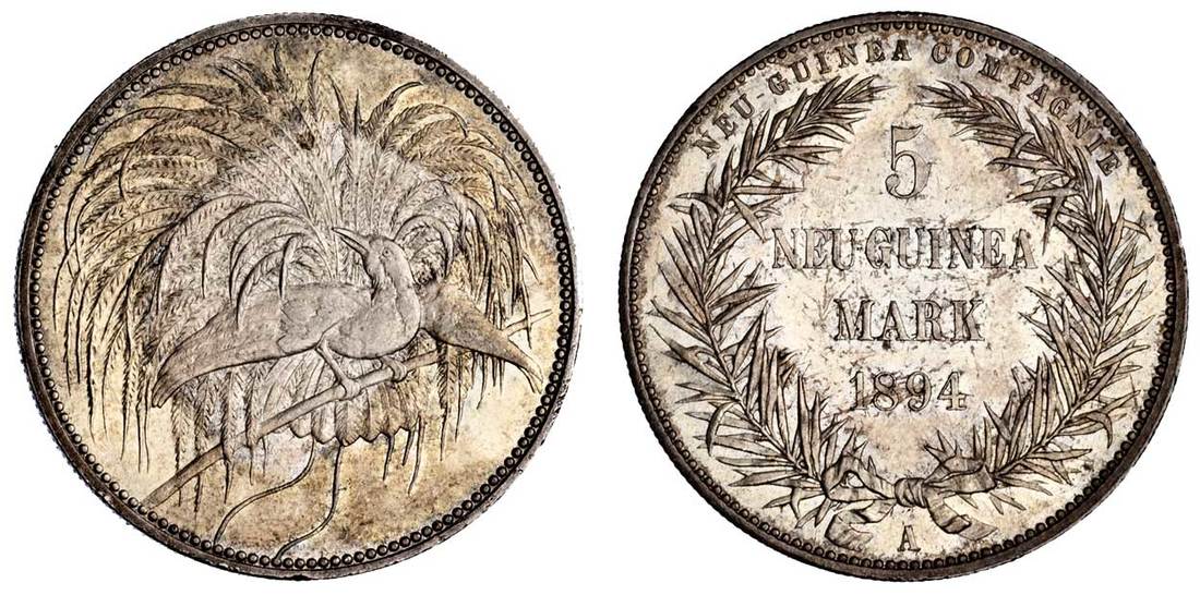 German New Guinea. Neu-Guinea Compagnie. 5 Mark, 1894 A. Resplendent Bird of Paradise, rev. Value and date within wreath. KM 7. Pale pearly slate-gray with soft iridescent hues over minor reverse stacking marks at center. About Uncirculated-Uncirculated.