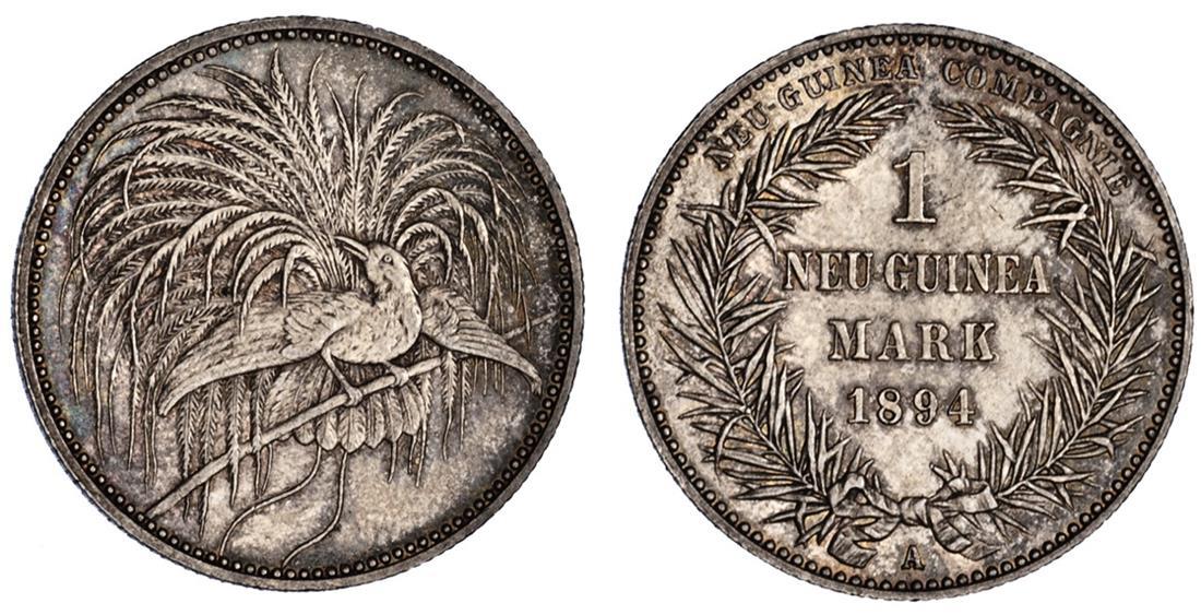German New Guinea. Neu-Guinea Compagnie. Mark, 1894 A. Resplendent Bird of Paradise, rev. Value and date within wreath. KM 5. Soft iridescent hues. Extremely Fine.