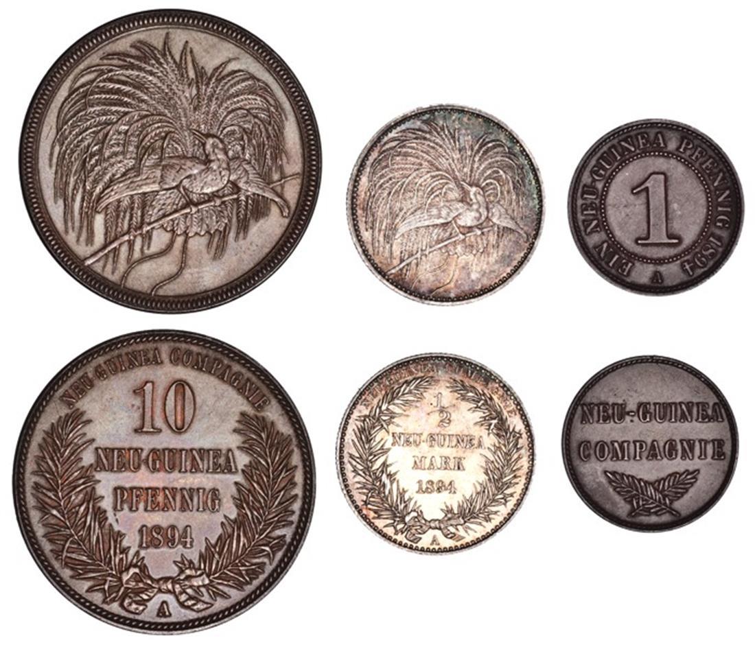 German New Guinea. Neu-Guinea Compagnie. Trio: ½ Mark, 1894 A; Pfennig and 10 Pfennig, 1894 A. First and last: resplendent Bird of Paradise, the middle company name above crossed palms. KM 1, 3, 4. The copper Extremely Fine and EF-AU, the silver About Uncirculated with light iridescent hues. (3)