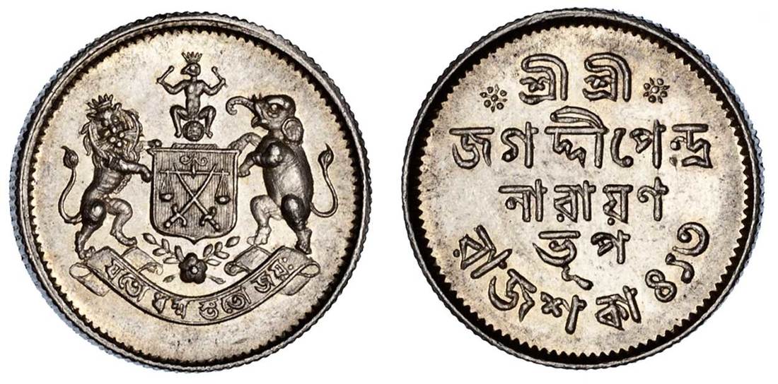 Indian Princely States. Cooch Behar. Jagaddipendra Narayan (1922-1949). Nazarana Half Rupee, CB 413 (1923 AD). Arms supported by crowned lion and elephant. X# M11. Bold strike. Brilliant Uncirculated.