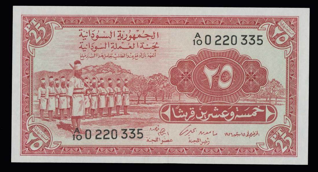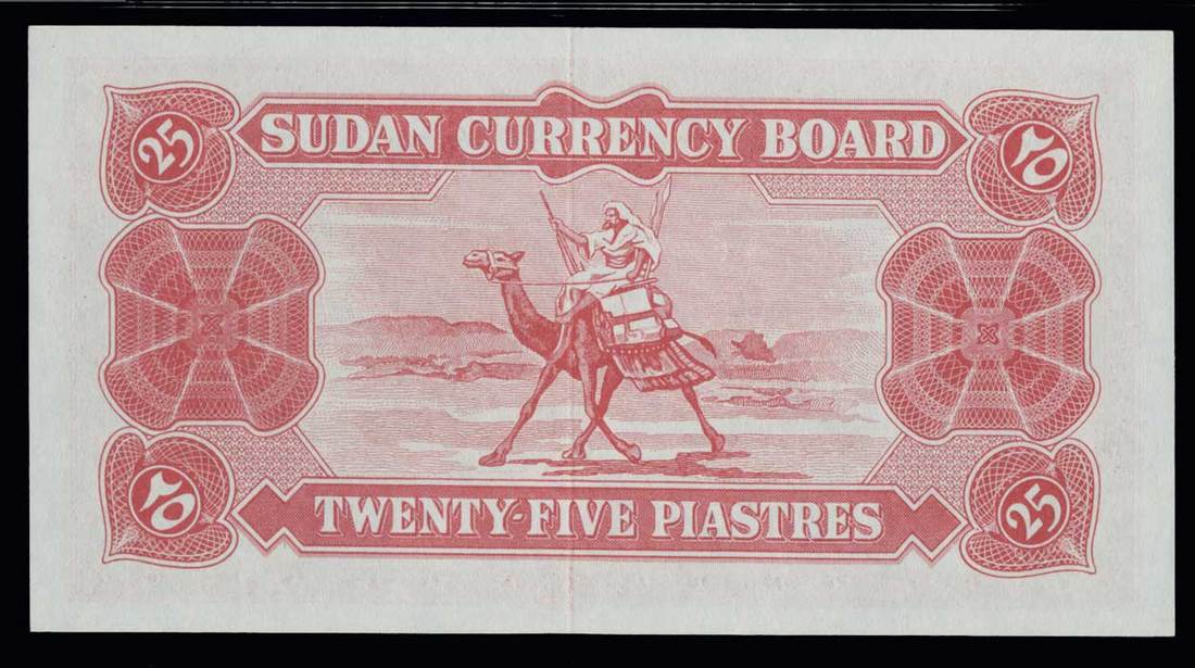 Sudan. Sudan Currency Board. 25 Piastres. 1956. P-1A. Dress guard at left, warrior riding camel on back. PMG Gem Uncirculated 66 EPQ.