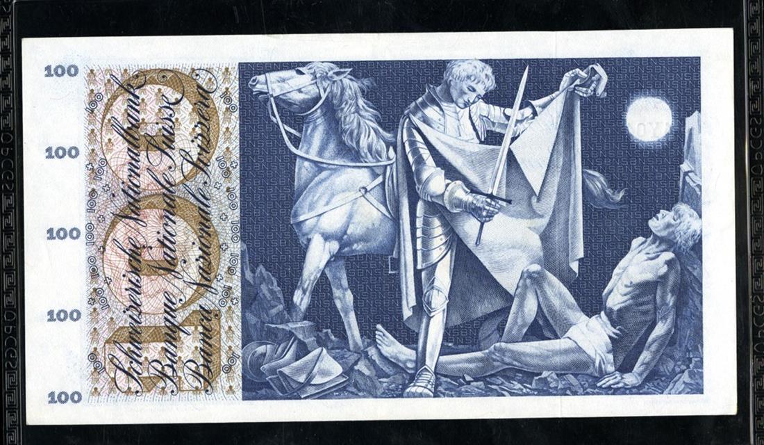 Switzerland. Schweizerische Nationalbank. 100 Franken. 1963. P-49e. Boy with lamb at right; St. Martin cutting his cape to share on back. PCGS Choice EF 45 OPQ.