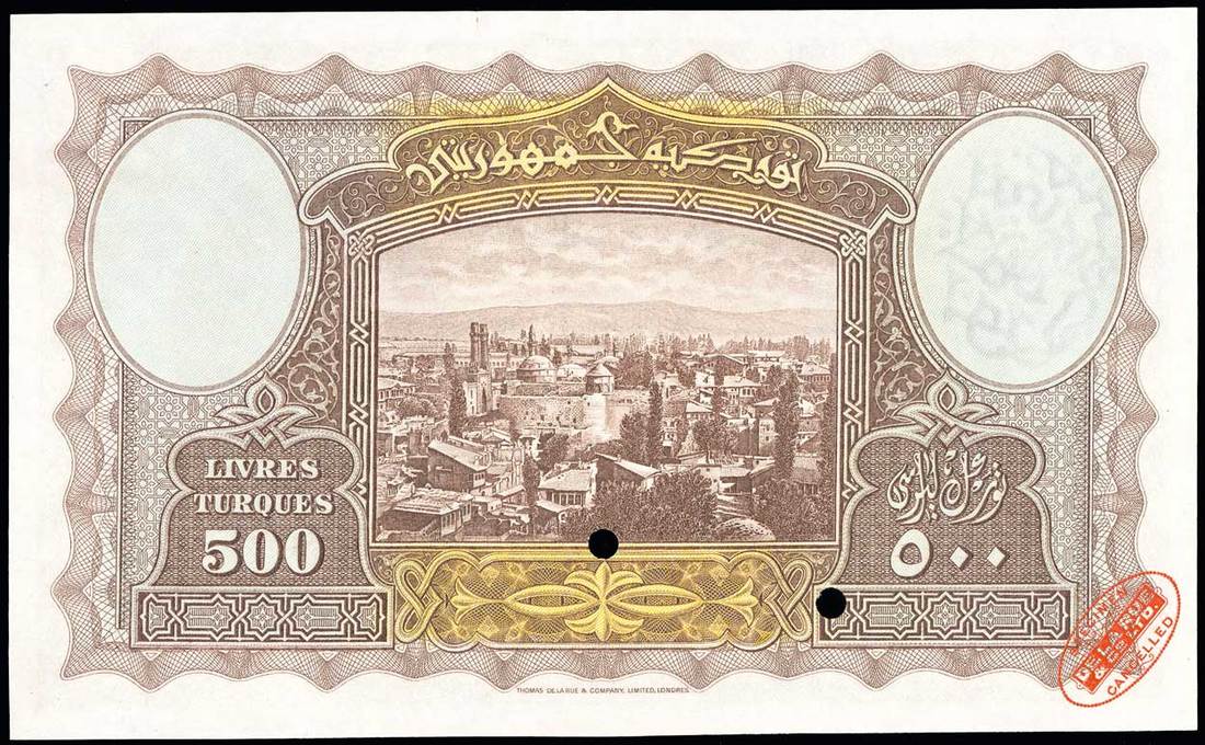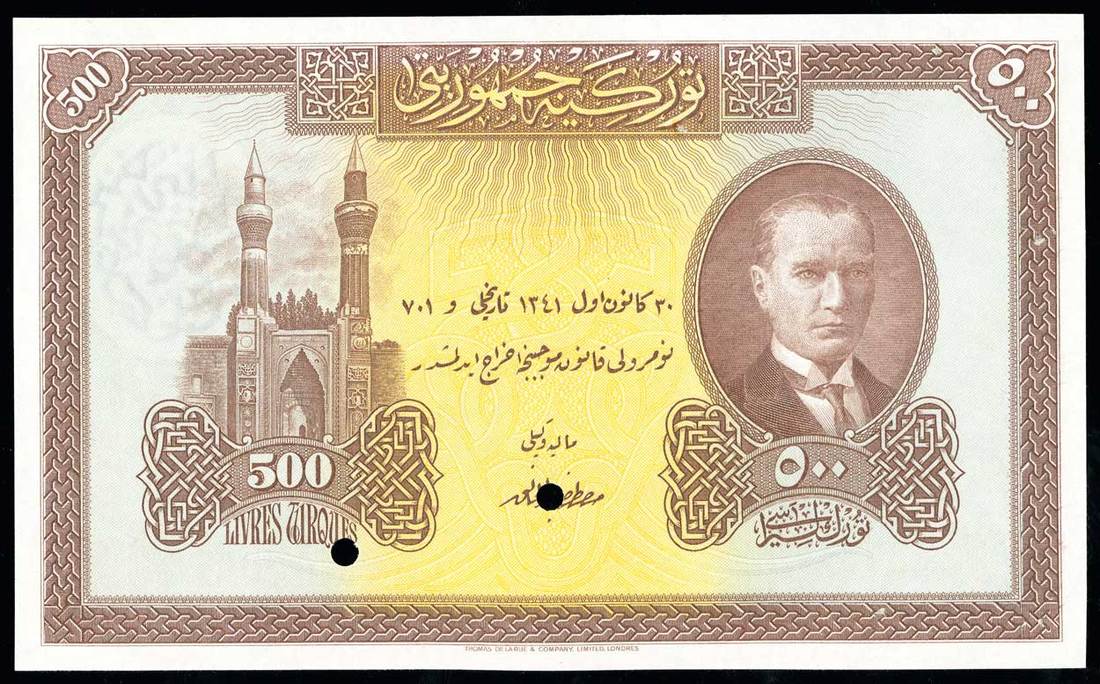 Turkey. Republic. State Notes of the Ministry of Finance. 500 Livres. 1926. P-124s. Specimen. Brown on pale blue and gold underprint. Mosque at left, portrait of Kemal Atatürk at right; cityview on back. Arabic legends. Red oval De LA Rue Cancelled stamp bottom right on back. Uncirculated.