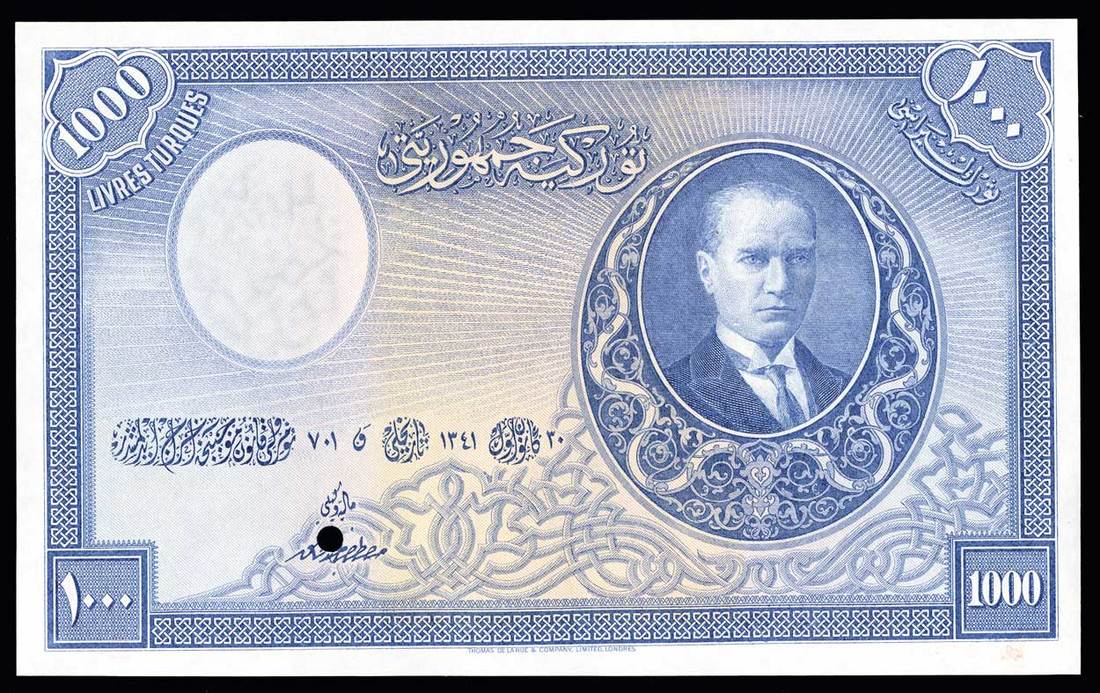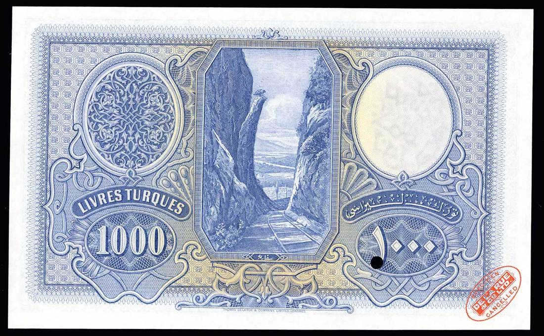 Turkey. Republic. State Notes of the Ministry of Finance. 1000 Livres. 1926. P-125s. Specimen. Dark blue on pale orange-gold underprint. Portrait of Kemal Atatürk at right, framed by ornate cerscent; railroad tracks through mountain pass at center on back. Arabic legends. Red oval De LA Rue Cancelled stamp bottom right on back. Very faint red stain in the lower right front margin. Uncirculated.