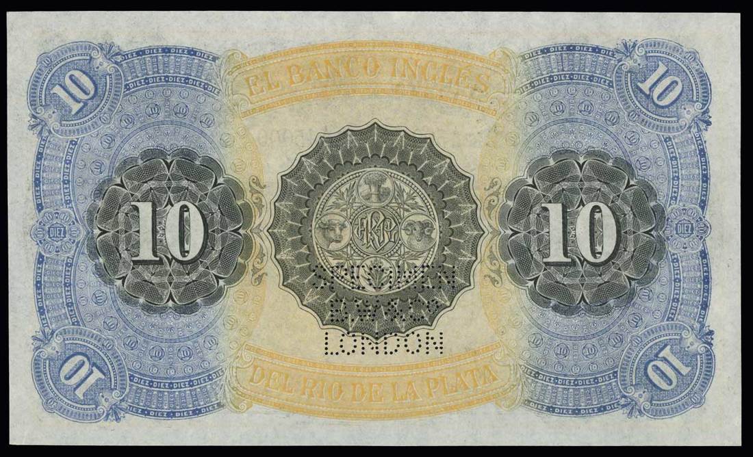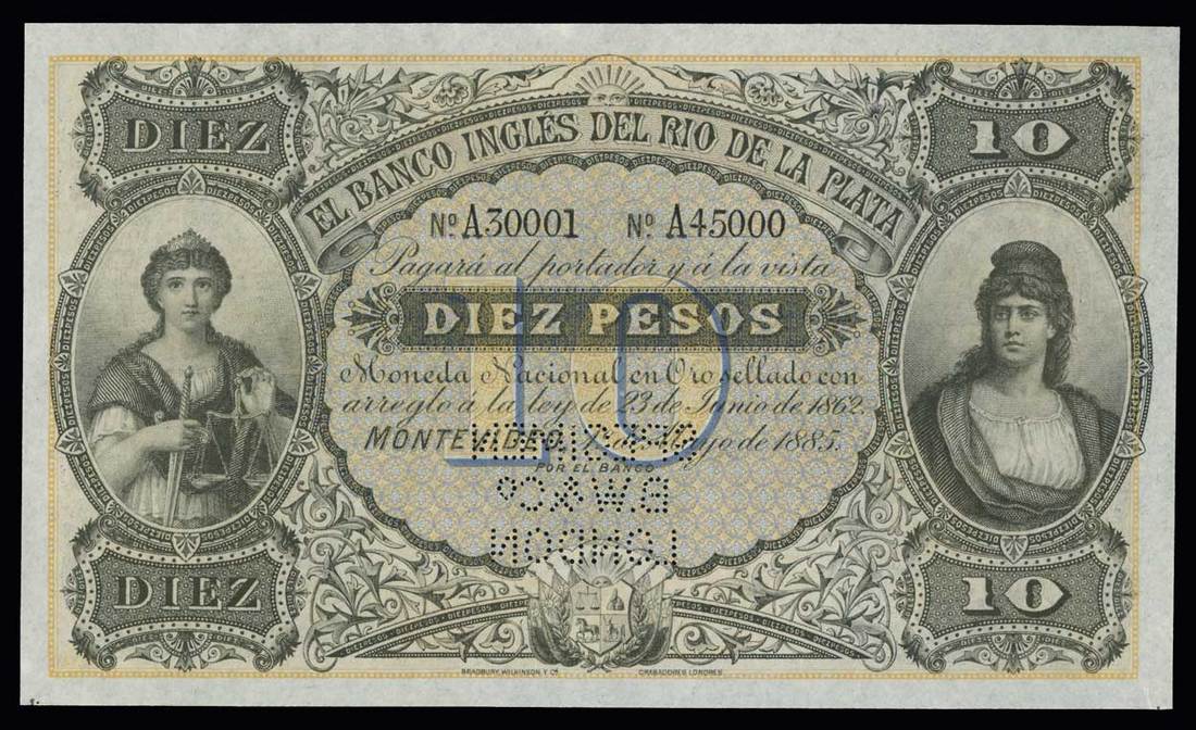 Uruguay. Banco Inglés del Rio de la Plata, Montevideo. 10 Pesos. 1885. P-S191s. Black on blue and orange underprint. Justicia at left, Libertad at right, Arms bottom center. Back - black, blue, light green and orange: small vignettes of cow, ram, sheaf of wheat and plant at center. Stencilled at back center SPECIMEN B.W. & Co LONDON in three lines. Crisp Uncirculated.