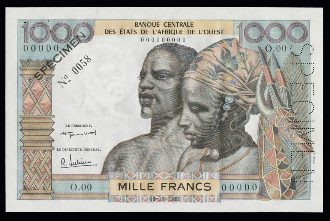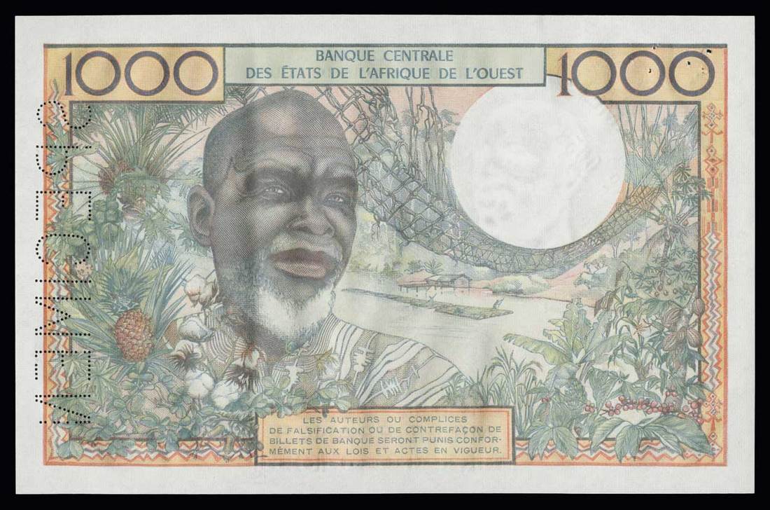 West African States. Banque Centrale des États de l'Afrique de l'Ouest. 1000 Francs. 1959. P-4s. Specimen. Brown, blue-green and multicolor. Man and woman at center; Older man and rope bridge on back. SPÉCIMEN No 0058 in black diagonally top left front. AU, pinholes.