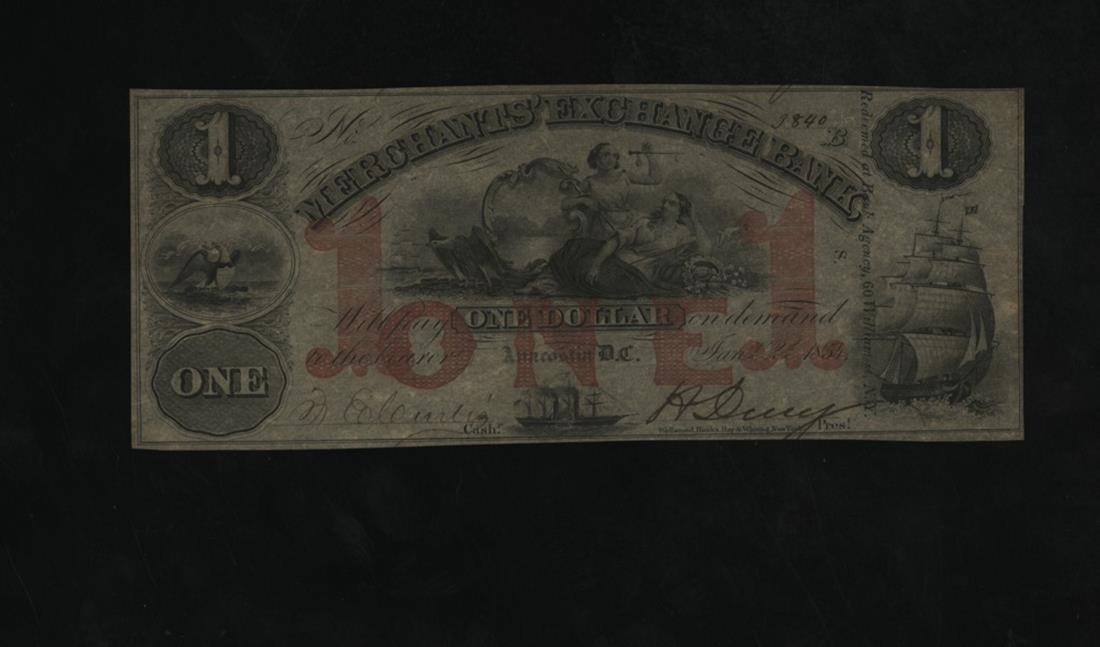 District of Columbia. Anacostia. Merchants' Exchange Bank. $1. 1854. (DC45-G2a). No.3840. Red. Two women and eagle flank shield. Sailing ship, right. Steamer below. WHHW. Uncirculated.