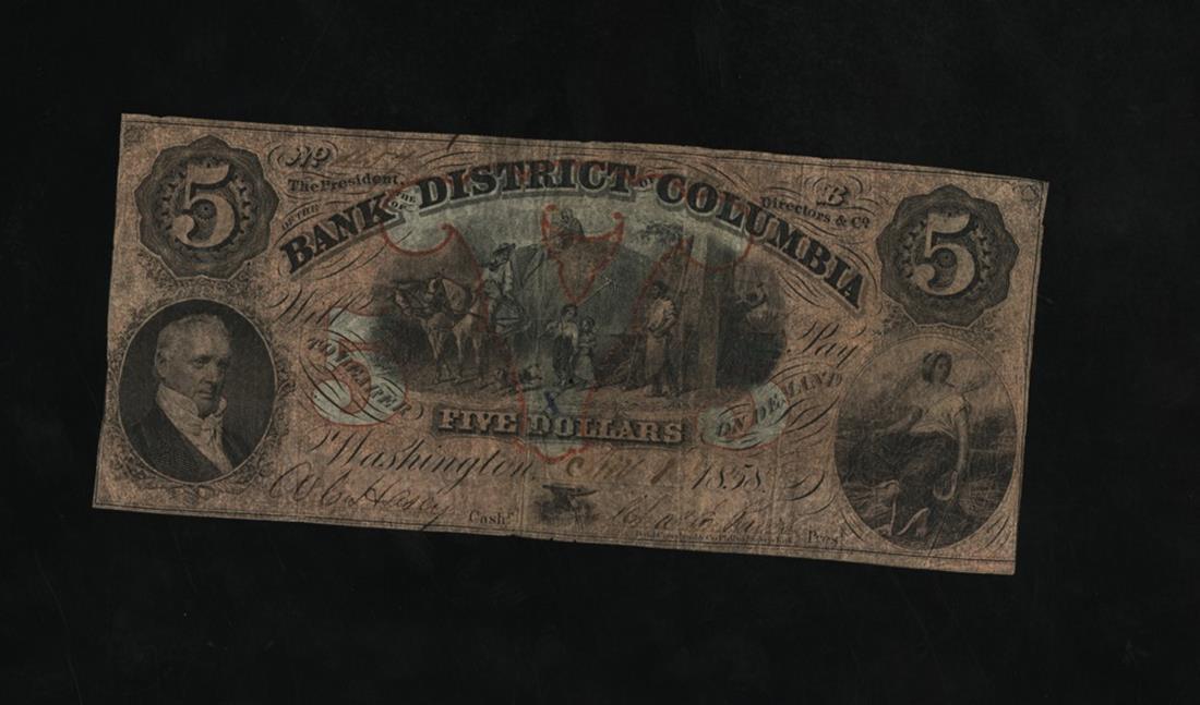District of Columbia. Washington. Bank of the District of Columbia. $5. 1858. (DC215-G8A). No.457. Orange. Hay wagon. Buchanan, left. Bald, Cousland. Fine.