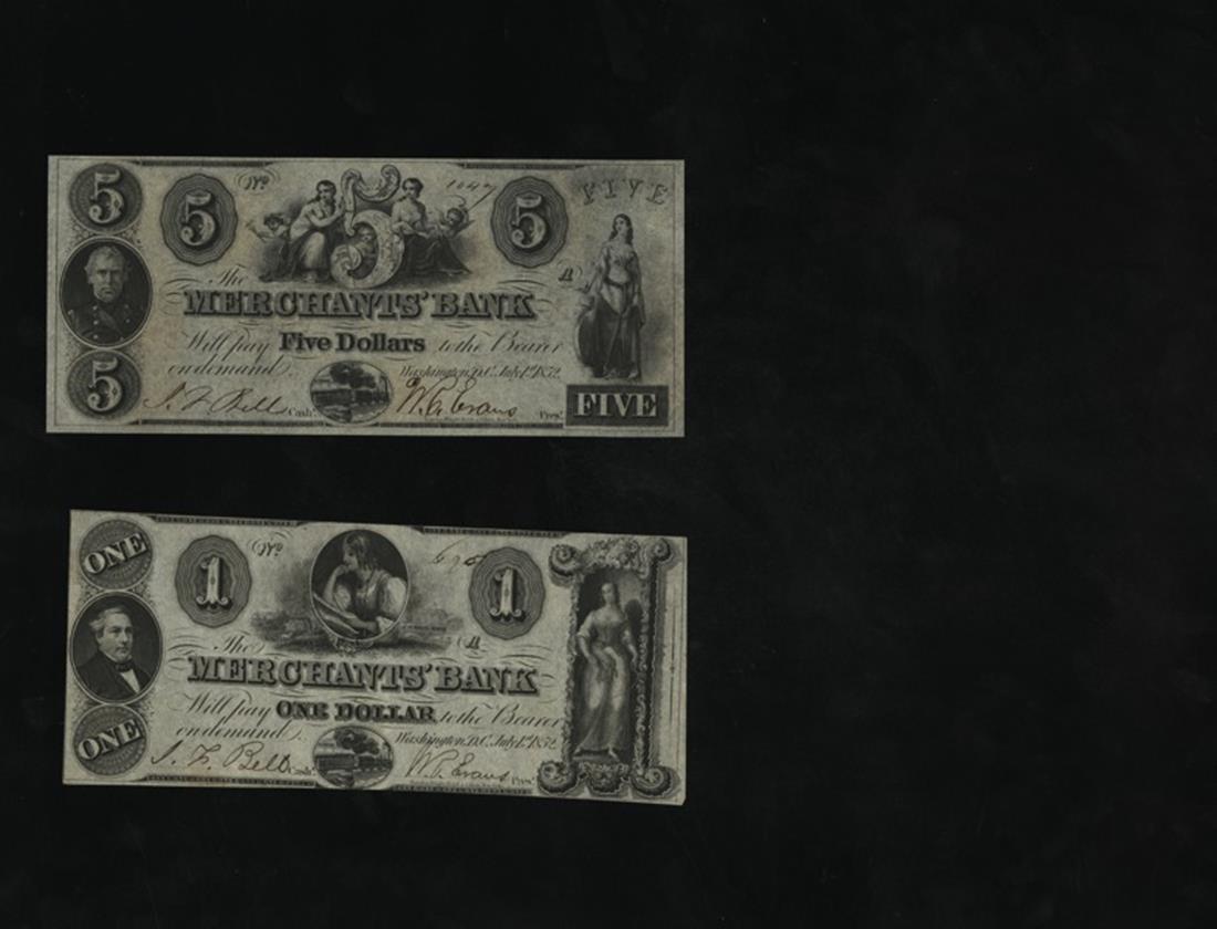 District of Columbia. Washington. Merchants' Bank Pairing. $1 1852 DC275-G2, Fillmore, woman with book, woman stands in large 1, train; $5 1852 DC275-G6, Women and cherubs around large ornate 5, Zachary Taylor, train below, Uncirculated. [2] 75-$150