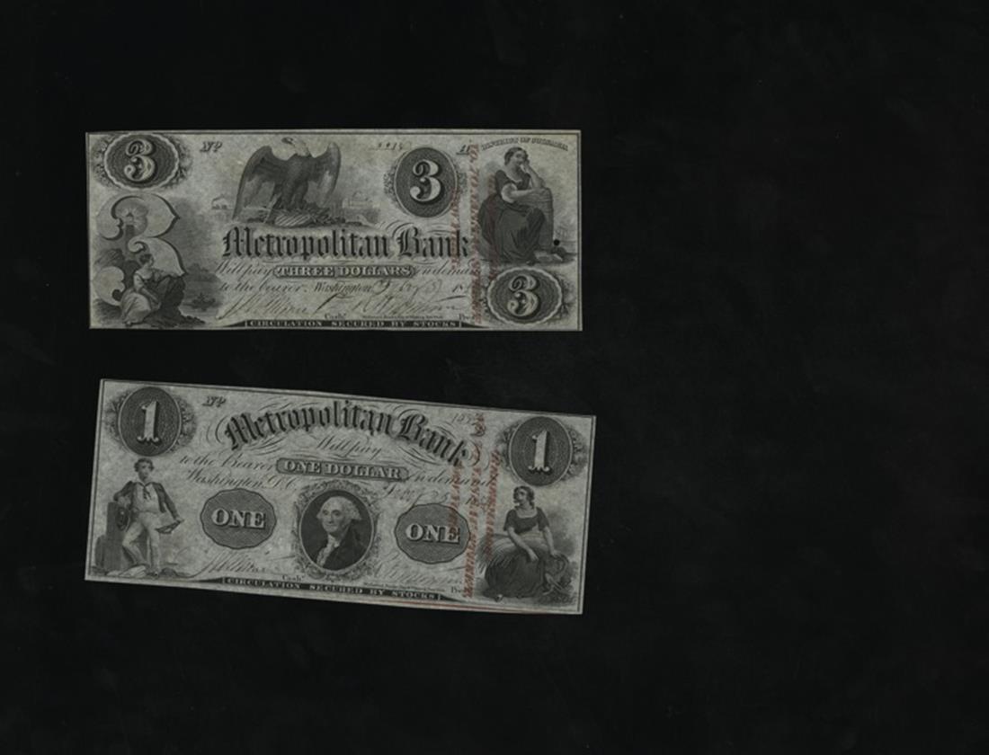 District of Columbia. Washington. Metropolitan Bank Pair. $1 1857 DC295-G2a, Washington portrait, sailor, left. Girl, right. Uncirculated; $3 1857 DC295-G6a, eagle, Uncirculated, small punch hole. WHHW. [2]