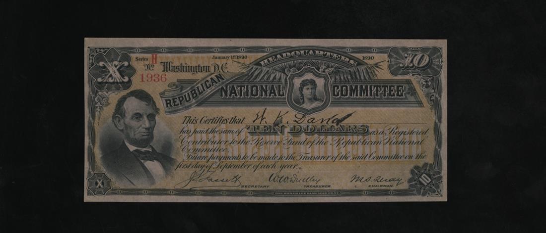 District of Columbia. Washington. Republican National Committee. $10. 1890. No.1936. Pink. Abraham Lincoln. Homer Lee Bank Note. AU.