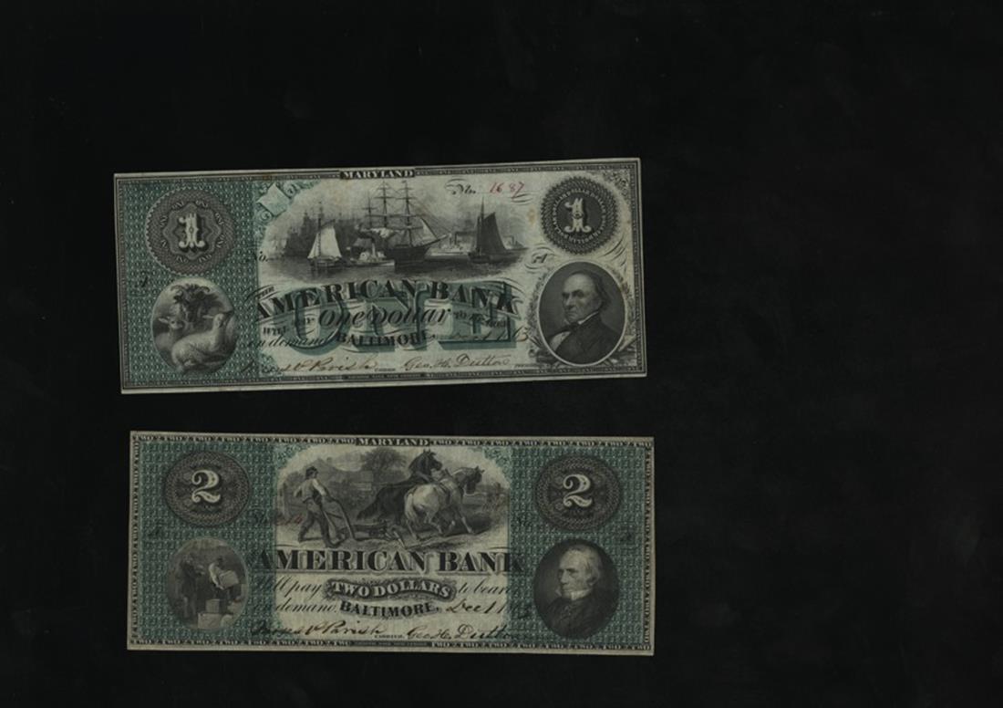 Maryland. Baltimore. Colorful American Bank Pairing Engraved and Printed by National Bank Note Company. $1 1863 MD10-G2a, ships in the harbor, sheep, Daniel Webster, VF-EF; $2 1863 MD10-G43a, horses pulling plow, men with crates, Henry Clay, VF or better. [2]