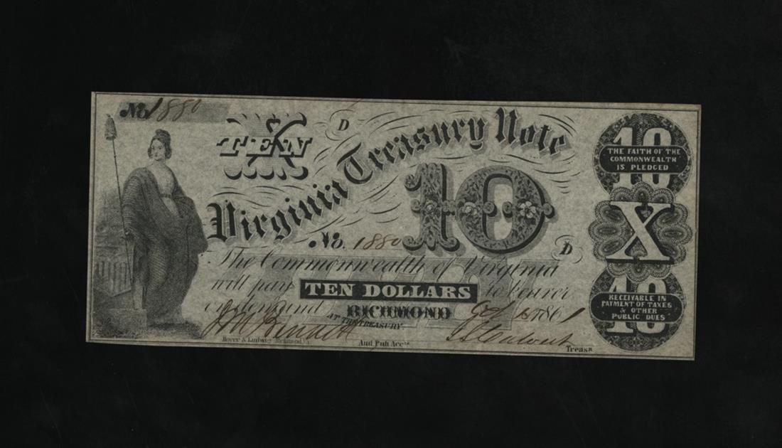 Virginia. Richmond. Virginia Treasury Note. $10. 1861. (Cr.4). No.1880. Liberty standing with pole. Hoyer & Ludwig. Choice Almost Uncirculated.
