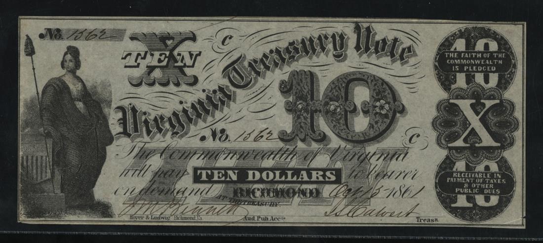Virginia. Richmond. Virginia Treasury Note. $10. 1861. (Cr.4) Fully issued. No.1562. Liberty standing with pole. Hoyer & Ludwig. PCGS Choice About New 55.