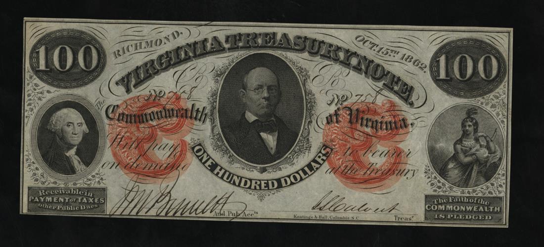 Virginia. Richmond. Virginia Treasury Note. $100. 1862. (Cr.6b). No.758. Orange C on either side of portrait. Governor Letcher. George Washington. Indian princess. Keatinge & Ball, Columbia, S. C. Uncirculated.