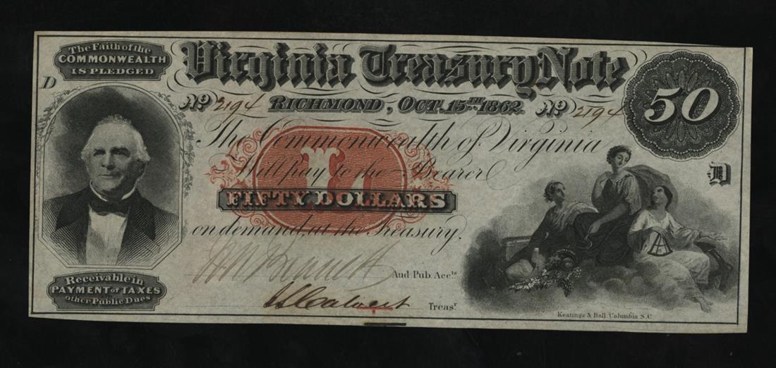 Virginia. Richmond. Virginia Treasury Note. $50. 1862. (Cr.7). No.2194. Red orange overprint. Governor Mason. Three women. Keatinge & Ball, Columbia, S. C. Uncirculated. Light teller handling.