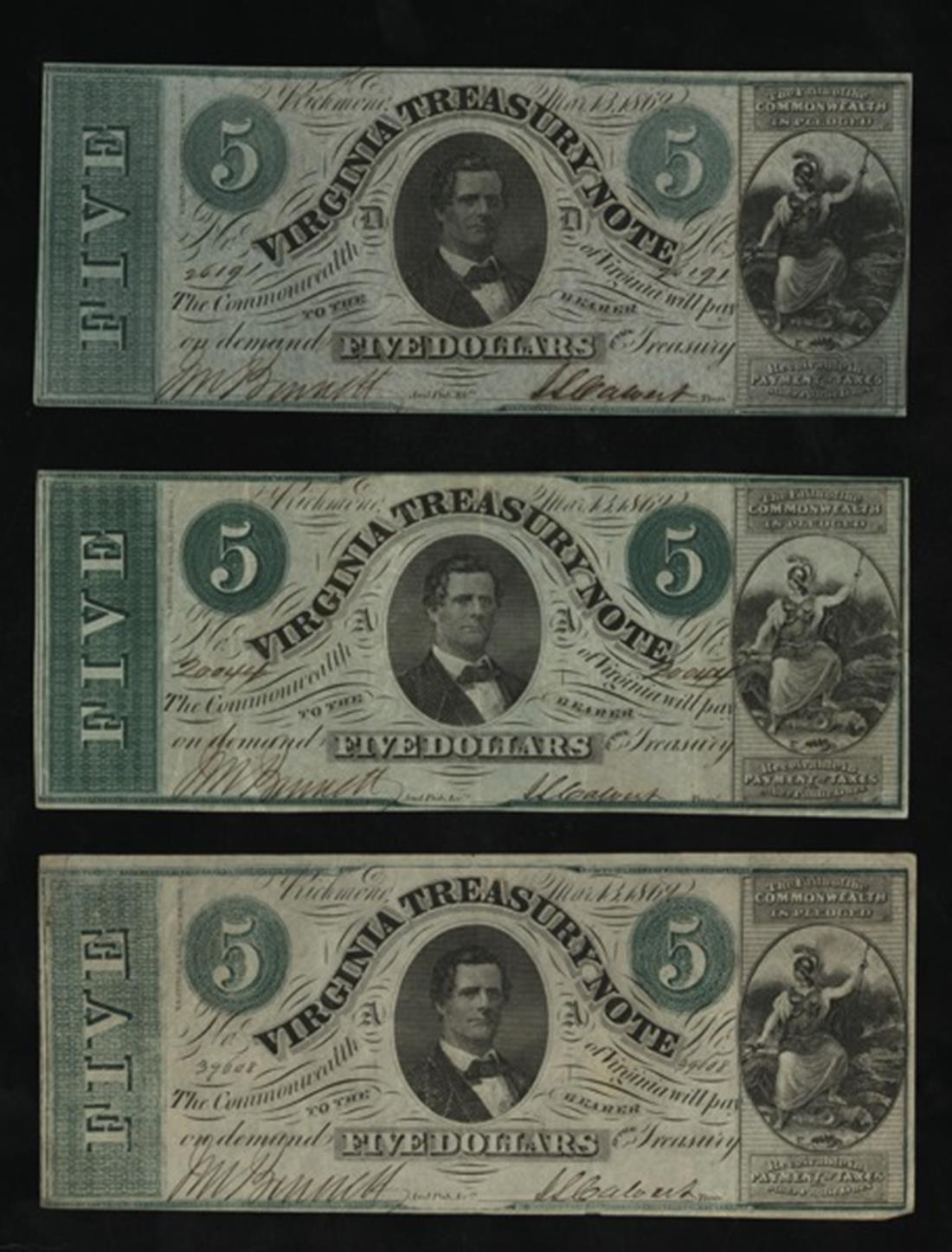 Virginia. Richmond. Virginia Treasury Note. $5. 1862. (Cr.13) Fully issued. Green. Governor Bennett. Keatinge & Ball, Columbia, S. C. VF, VF, Uncirculated. [3]