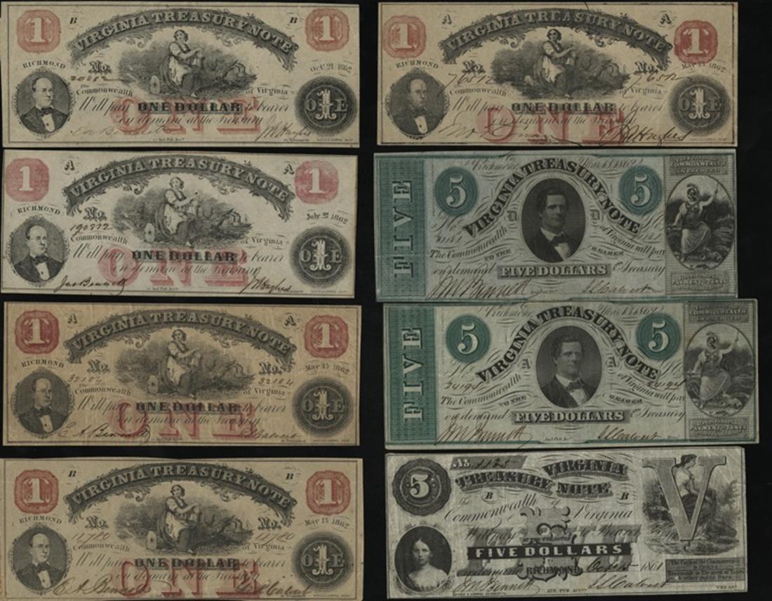 Virginia. Richmond. Virginia Treasury Note Assortment. $5 1861 Cr.8, #1135, VF; $5 1862 Cr.13, VF-EF, mounting remnants; Similar, Unc. with light teller handling; $1 May 17, 1862 Cr.16(3) VF, VF and EF; $1 July 21, 1862 Cr.17, AU; $1 Oct. 21, 1862 Cr.18, AU. [8]