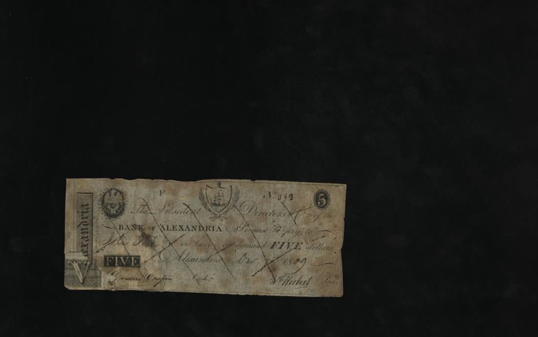 Virginia. Alexandria. Bank of Alexandria. $5. 1809. (BA05-05) Counterfeit (genuine examples are not known). No.393. "Alexandria" in the left end panel, eagle, shield. Fine details.