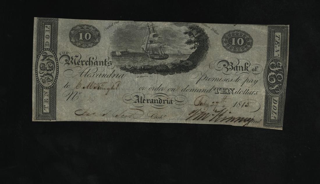 Virginia. Alexandria. Merchants Bank of Alexandria. $10. 1815. (BA25-26). No.225. 10 in left top counter. Sailing vessel. W. Harrison. VF.