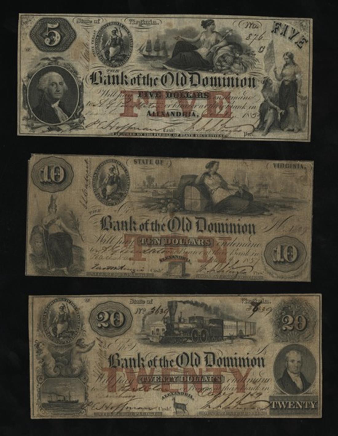 Virginia. Alexandria. Bank of the Old Dominion Pearlisburg Branch Selection. $5 1857 BA30-09, Commerce seated, Washington, left, red overprint, F-VF, Rarity 5E; $101851 BA30-14, woman reclines on bale, red TEN, About Fine, mounting remnants, Rarity 5E; $20 1859 BA30-21, red TWENTY, train, Fine, right serial number corrected, Rarity 7F. [3]