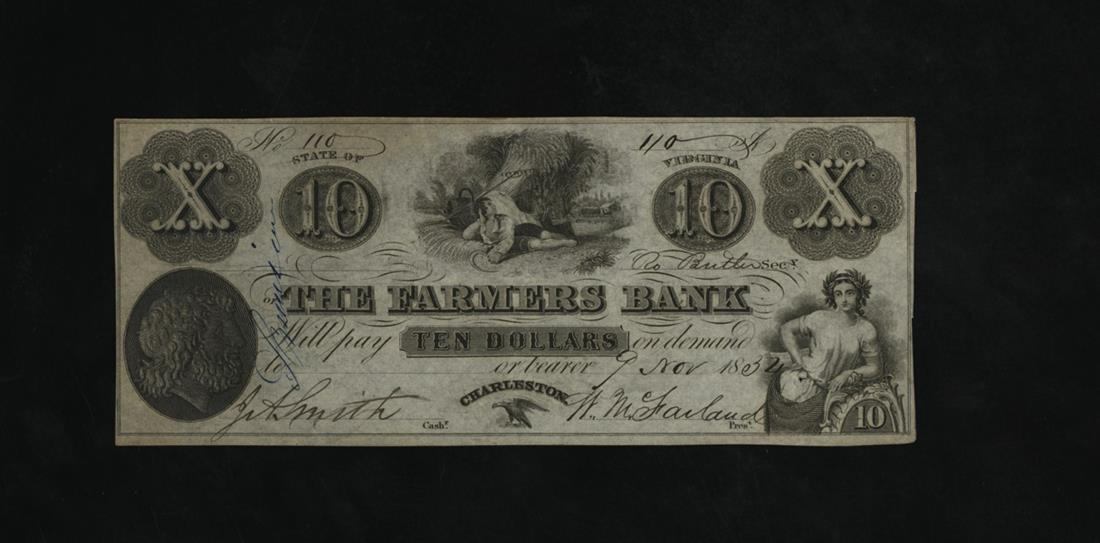 Virginia. Charleston. Farmers Bank. $10. 1852. (BC10-10). Farm boy beneath tree. Medallion head, left. Woman, right. EF-AU.