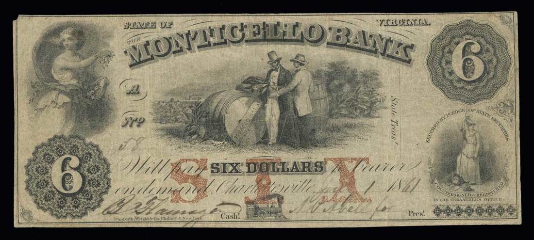 Virginia. Charlottesville. Monticello Bank. $6. 1861. (BC25-17). No.58. Red SIX underprint. Men by tobacco barrels, girl with flowers, State arms, locomotive below. Danforth, Wright. Fine.