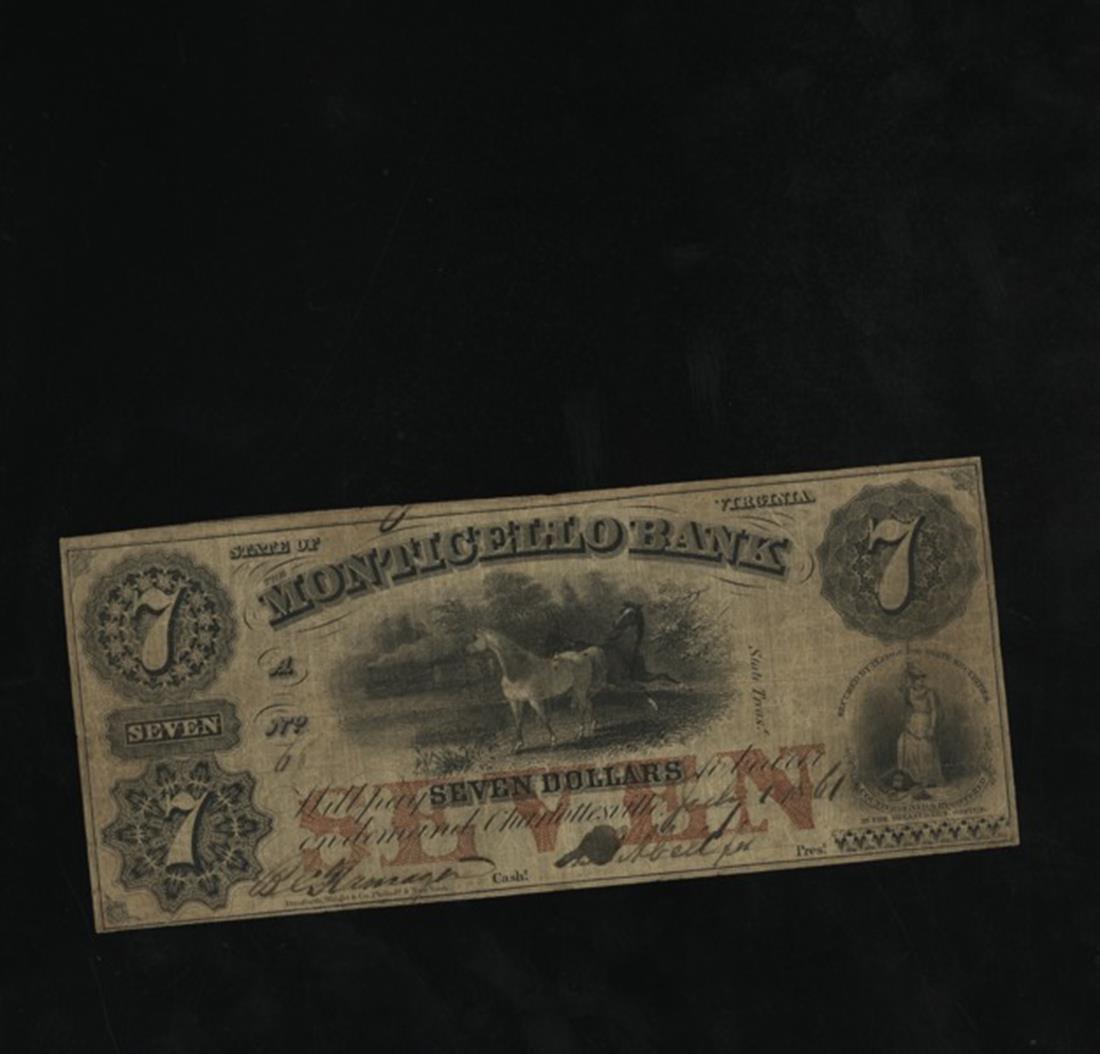 Virginia. Charlottesville. Monticello Bank. $7. 1861. (BC25-19A). No.68. Red SEVEN underprint. Black and white horses, train in the distance. Danforth, Wright. Fine.